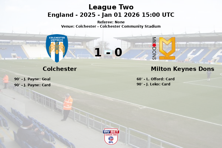 Le match est resté vierge de tout but jusqu’au temps additionnel. À la 90e minute, un penalty en faveur de Colchester a été transformé par J. Payne, déclenchant l’euphorie dans les tribunes. Payne, cependant, a reçu un carton jaune quelques instants plus tard. Le match s’est terminé par un match nul, laissant un goût doux-amer aux deux équipes. Milton Keynes Dons a commis plus de fautes, 14 contre 9, et a reçu deux cartons jaunes.