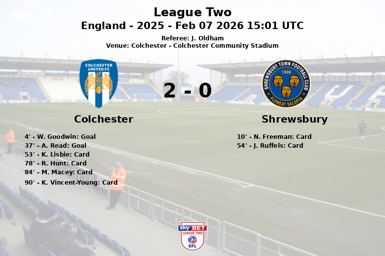 Après seulement quatre minutes, W. Goodwin a ouvert le score pour Colchester, grâce à une passe décisive de S. Tovide, déclenchant l’euphorie parmi les supporters locaux. La domination de Colchester s’est poursuivie, et à la 37e minute, A. Read a élargi l’avance, consolidant leur contrôle du match.