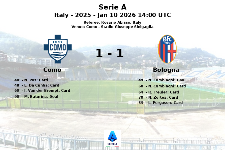 Malgré l’infériorité numérique, Bologne s’est défendu bec et ongles, résistant aux assauts de Como jusqu’au temps additionnel. C’est alors, à la 90e minute, que M. Baturina, assisté par J. Rodriguez, a marqué le but égalisateur pour Como, déclenchant l’euphorie au Stadio Giuseppe Sinigaglia. Le match s’est terminé par un partage des points, laissant un goût doux-amer aux deux équipes. L’arbitre Rosario Abisso a montré un total de 3 cartons jaunes à Como et 3 à Bologne, en plus du carton rouge à N. Cambiaghi.