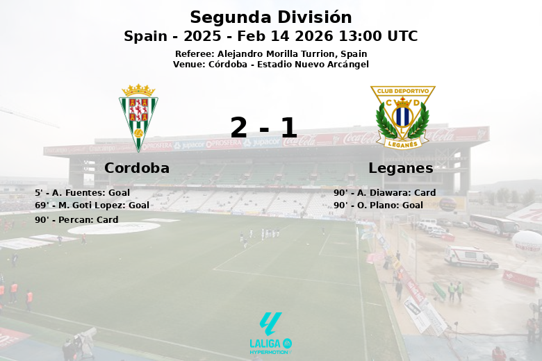 Cordoue a frappé en premier à la 5e minute, avec un but de A. Fuentes après une excellente passe décisive d’Alex Martin. L’équipe locale a maintenu la pression et a augmenté son avance à la 69e minute grâce à un but de M. Goti Lopez.