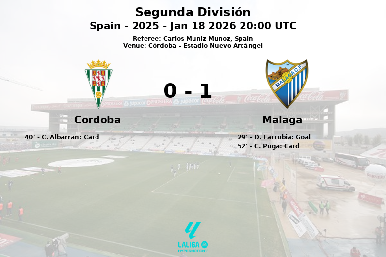Córdoba, Espagne – Le Málaga Club de Fútbol s’est imposé face au Córdoba CF au stade Nuevo Arcángel lors d’un match comptant pour la 22e journée de la Segunda División. L’unique but de David Larrubia à la 29e minute, suite à une action sans passe décisive spécifiée, a suffi à faire pencher la balance en faveur des visiteurs.