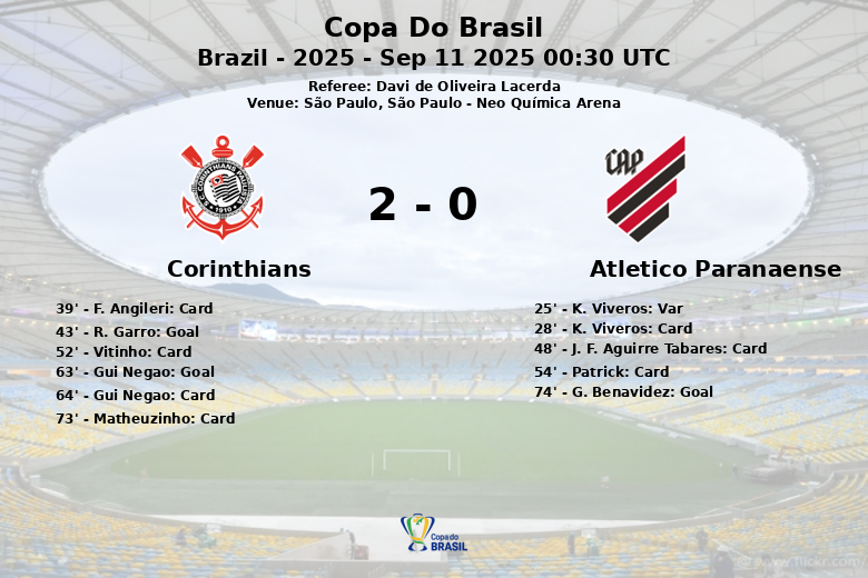 Corinthians a ouvert le score à la 43ème minute avec un but de R. Garro, sur une passe de Gui Negao. En seconde période, Gui Negao a augmenté l’avance de Corinthians à la 63ème minute, cette fois assisté par R. Garro, solidifiant ainsi leur contrôle du match. Malgré la domination de Corinthians, l’Atlético Paranaense a tenté de réagir et a eu une occasion en or de réduire l’écart à la 74ème minute, mais G. Benavidez a manqué un penalty.