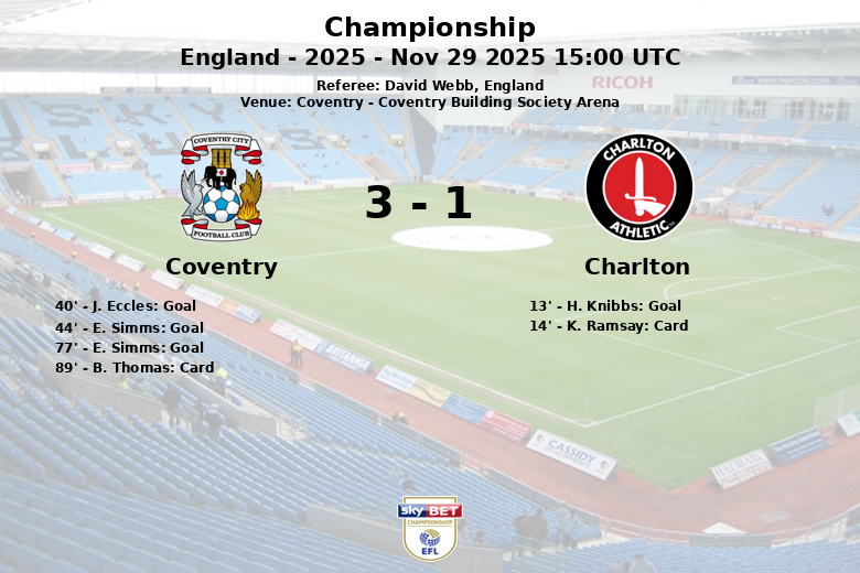 Coventry, Angleterre – Dans un match disputé au Coventry Building Society Arena, Coventry a remporté une victoire 3 à 1 contre Charlton Athletic. Le match, comptant pour la 18ème journée de Championship, a été marqué par la domination de Coventry, qui a bénéficié de 69% de possession du ballon.