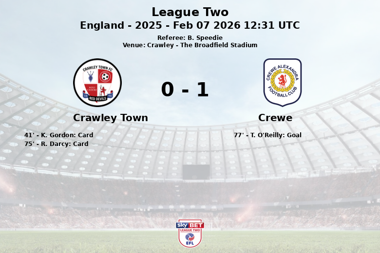 Malgré les efforts de Crawley, qui a tenté d’égaliser jusqu’à la fin, Crewe a su conserver son avantage et assurer les trois points. L’arbitre B. Speedie a bien géré le match, qui s’est déroulé dans une ambiance de forte compétitivité.