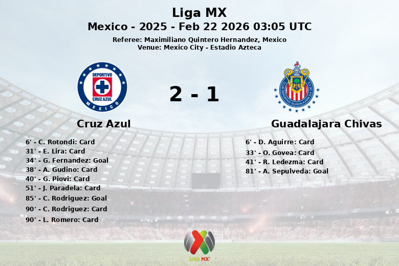Le match, valable pour la 7e journée du Clausura 2025 de la Liga MX, s’est caractérisé par un nombre élevé de fautes (15 pour Cruz Azul et 17 pour Chivas) et un total de 10 cartons jaunes. Bien que Chivas ait dominé la possession du ballon avec 62 %, Cruz Azul a été plus efficace devant le but, marquant sur deux de ses trois tirs cadrés. L’arbitre Maximiliano Quintero Hernández a passé une soirée agitée à contrôler une rencontre chargée de tension.