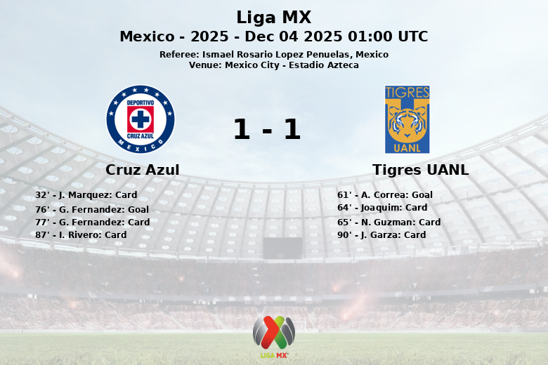 Le match est resté vierge de tout but jusqu’à la 61e minute, lorsque A. Correa de Tigres UANL, assisté par Romulo, a réussi à ouvrir le score. Malgré sa domination, Cruz Azul n’a pas trouvé le moyen de concrétiser ses occasions.