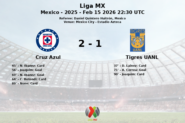 En seconde période, le match s’est encore enflammé. Un but contre son camp de Joaquim à la 56e minute a donné l’avantage à Cruz Azul, suivi d’un but de N. Ibanez à la 60e minute, augmentant l’écart. Tigres UANL a réagi avec un but de A. Correa à la 71e minute, assisté par V. Lorona, mais cela n’a pas suffi à éviter la défaite.
