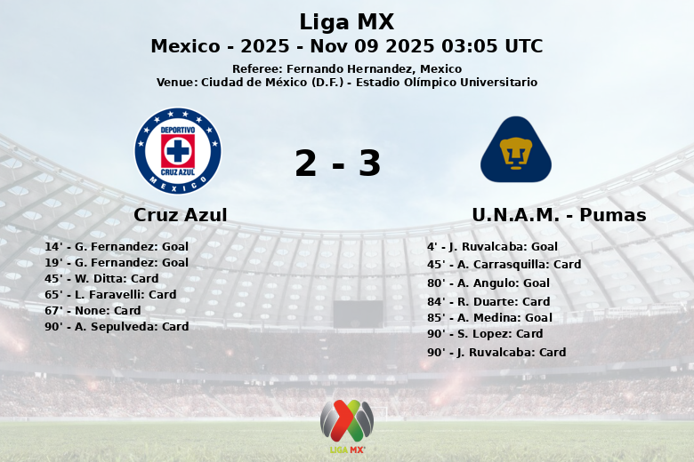 Le match a commencé avec Pumas prenant l’avantage dès le début. À la 4ème minute, J. Ruvalcaba, assisté par A. Angulo, a ouvert le score pour l’équipe locale. Cependant, Cruz Azul a réagi rapidement, et avec un doublé de G. Fernandez aux 14ème et 19ème minutes, a renversé le score, donnant l’avantage à l’équipe visiteuse.