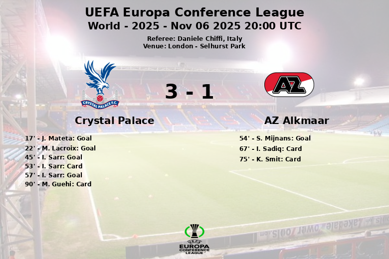 Malgré un plus grand nombre de tirs de Crystal Palace (20 contre 8 pour l’AZ Alkmaar), l’équipe néerlandaise a conservé la possession du ballon pendant une grande partie du match. Le match a également été marqué par l’intensité, avec plusieurs cartons jaunes montrés aux joueurs des deux équipes : I. Sarr (53e) et M. Guehi (90e) pour Crystal Palace, et I. Sadiq (67e) et K. Smit (75e) pour l’AZ Alkmaar. Crystal Palace remporte une victoire bien méritée à domicile en Ligue Europa Conférence de l’UEFA.