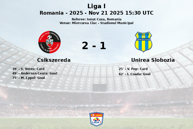 Le match s’est animé dès le début, avec un carton jaune pour V. Pop d’Unirea Slobozia à la 25e minute, suivi d’un autre pour S. Veres de Csikszereda à la 39e. La seconde mi-temps a apporté l’excitation des buts. Anderson Ceara a ouvert le score pour Csikszereda à la 49e minute, grâce à une passe décisive de S. Jebari. Cependant, Unirea Slobozia a répondu à la 62e minute avec un but de I. Coada. La tension est restée élevée, et M. Eppel a de nouveau donné l’avantage à Csikszereda à la 75e minute, avec une passe décisive de L. Paszka.
