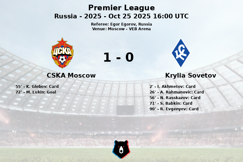 Le seul but du match est arrivé à la 72e minute, œuvre de M. Lukin, assisté par I. Oblyakov, qui a couronné la domination du CSKA. Malgré les efforts du Krylia Sovetov pour réagir, la défense du CSKA est restée solide et a concédé peu d’occasions claires. Le match s’est terminé par une victoire du CSKA Moscou, reflétant sa supériorité en termes de possession, de tirs cadrés et du seul but du match. L’arbitre Egor Egorov, de Russie, a eu un match bien rempli signalant un total de 28 fautes.