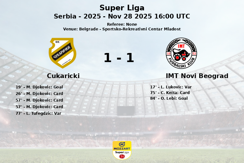 Cukaricki a pris l’avantage à la 19e minute grâce à un but de M. Djokovic, sur une passe décisive de S. Tedic. Cependant, Djokovic lui-même est passé de héros à méchant lorsqu’il a été expulsé à la 57e minute après avoir reçu un deuxième carton jaune. Il avait été averti précédemment à la 26e minute. Un but de L. Lukovic pour IMT Novi Beograd a été refusé pour hors-jeu à la 17e minute après examen de la VAR.