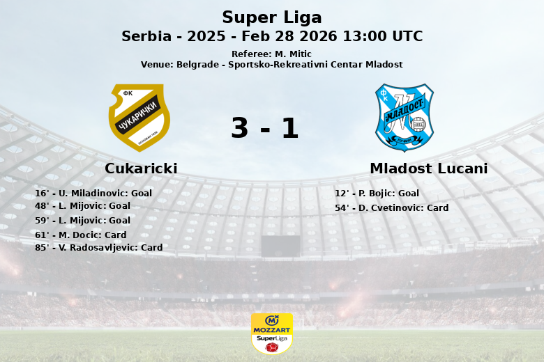 Belgrade, Serbie – Lors d’un match comptant pour la 25e journée de la Super Liga serbe, Cukaricki a vaincu Mladost Lucani grâce à une performance solide, malgré un début prometteur de l’équipe locale. Le match, qui s’est déroulé au Sportsko-Rekreativni Centar Mladost, était arbitré par M. Mitic.