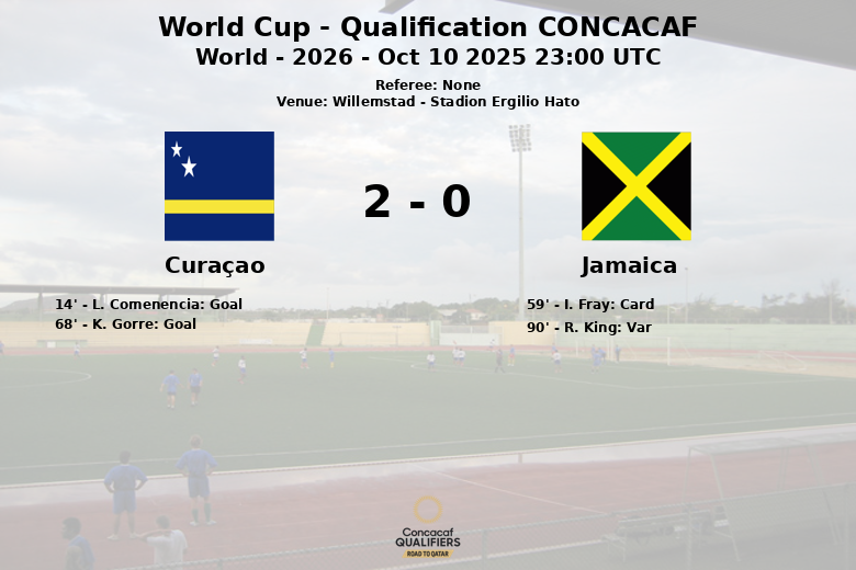 Curaçao a surpris la Jamaïque à Willemstad, au Stadion Ergilio Hato, lors d’un match de qualification pour la Coupe du Monde de la CONCACAF. Le match, correspondant au troisième tour final, a vu Curaçao prendre l’avantage à la 14e minute avec un but de L. Comenencia, sur une passe décisive de J. Bacuna. Malgré une possession de balle plus importante pour la Jamaïque (58% contre 42%), Curaçao s’est montré plus efficace en attaque. À la 68e minute, K. Gorre a amplifié l’avance pour l’équipe locale, sur une passe décisive de J. Locadia. La Jamaïque a tenté de réagir et a généré plus de tirs (17 contre 7 pour Curaçao), mais la défense curaçaise est restée solide. Un but de R. King pour la Jamaïque à la 90e minute a été annulé par la VAR en raison d’un hors-jeu, déjouant les espoirs de remontée de l’équipe visiteuse. Curaçao a terminé le match avec 42% de possession, 4 tirs cadrés et aucun carton jaune, tandis que la Jamaïque a accumulé 58% de possession, 6 tirs cadrés et un carton jaune.