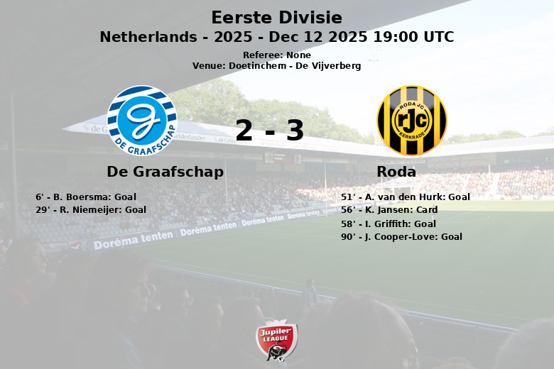 Le match a été caractérisé par une possession légèrement favorable à De Graafschap (53% contre 47% pour Roda). Les deux équipes ont pris 16 tirs, mais Roda a été plus précis, avec 8 tirs cadrés contre 6 pour De Graafschap. De Graafschap a dominé les corners, avec 7 contre 4 pour Roda, et a commis plus de fautes (14 contre 8).