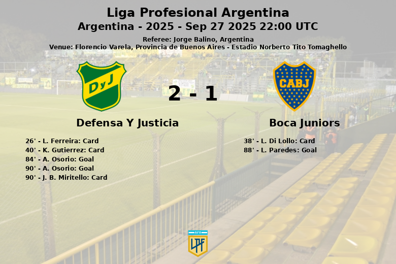 Le score a été ouvert à la 84e minute, lorsque A. Osorio a transformé un penalty pour Defensa y Justicia, déclenchant l’euphorie chez les supporters locaux. Cependant, la joie fut de courte durée, car L. Paredes a égalisé le score sur penalty à la 88e minute pour Boca Juniors.