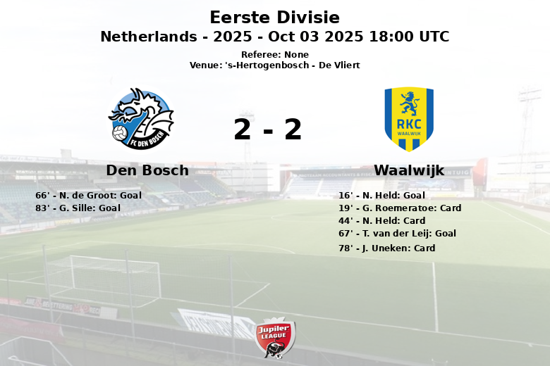 Dans un match vibrant qui s’est déroulé au stade De Vliert à ‘s-Hertogenbosch, Den Bosch et Waalwijk ont fait match nul dans une rencontre de l’Eerste Divisie riche en rebondissements jusqu’à la dernière minute. Waalwijk a pris l’avantage à la 16e minute grâce à un but de N. Held, sur une passe décisive de J. Altena. La première mi-temps a été marquée par l’intensité et quelques jeux rudes, comme en témoignent les cartons jaunes pour G. Roemeratoe et N. Held, tous deux de Waalwijk.