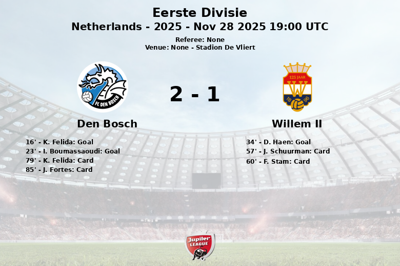Den Bosch a pris l’avantage rapidement avec un but de K. Felida à la 16e minute, sur une passe de J. Fortes. Peu de temps après, I. Boumassaoudi a creusé l’écart à la 23e minute. Cependant, Willem II n’a pas baissé les bras et a réduit le score à la 34e minute grâce à un but de D. Haen, sur une passe de A. Ciranni.