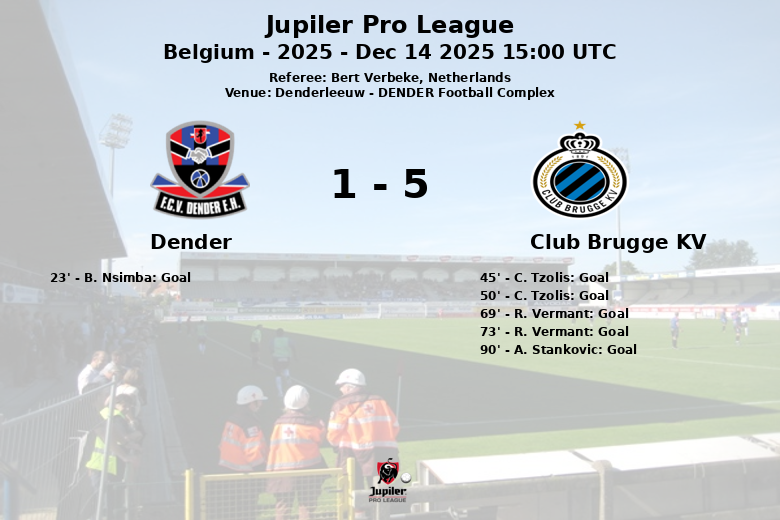 Lors d’un match disputé au DENDER Football Complex de Denderleeuw, le Club Brugge KV a vaincu de manière décisive Dender lors d’un match comptant pour la 18e journée de la Jupiler Pro League. L’équipe locale, Dender, a réussi à ouvrir le score à la 23e minute grâce à un but de B. Nsimba, sur une passe décisive de F. Ferraro, suscitant une explosion de joie parmi ses supporters. Cependant, cette joie n’a pas duré longtemps.