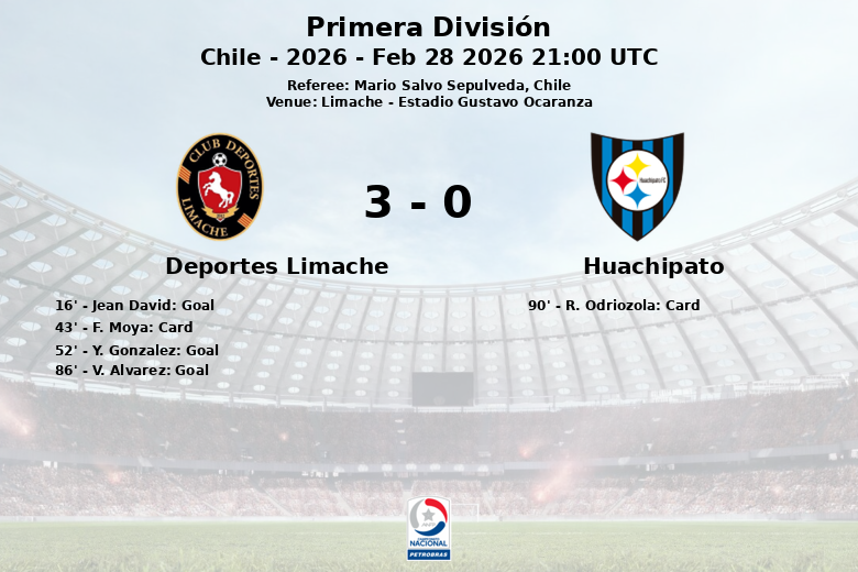 Remplacements dans l’quipe de deportes limache: À la 46e minute, F. Moya est entré et M. Llanten est sorti., À la 62e minute, J. Montecinos est entré et A. Alfonzo est sorti., À la 76e minute, G. Sosa est entré et M. Arturia est sorti., À la 84e minute, D. Castro est entré et C. Morales est sorti., À la 84e minute, Y. Gonzalez est entré et V. Alvarez est sorti.