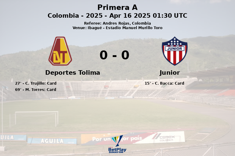 Remplacements dans l’quipe de deportes tolima: À la 64e minute, J. Hernandez est entré et J. Gonzalez est sorti., À la 64e minute, L. Miranda est entré et K. Perez est sorti., À la 73e minute, J. Quinones est entré et A. Arroyo est sorti., À la 86e minute, A. Parra Osorio est entré et J. Nieto est sorti.