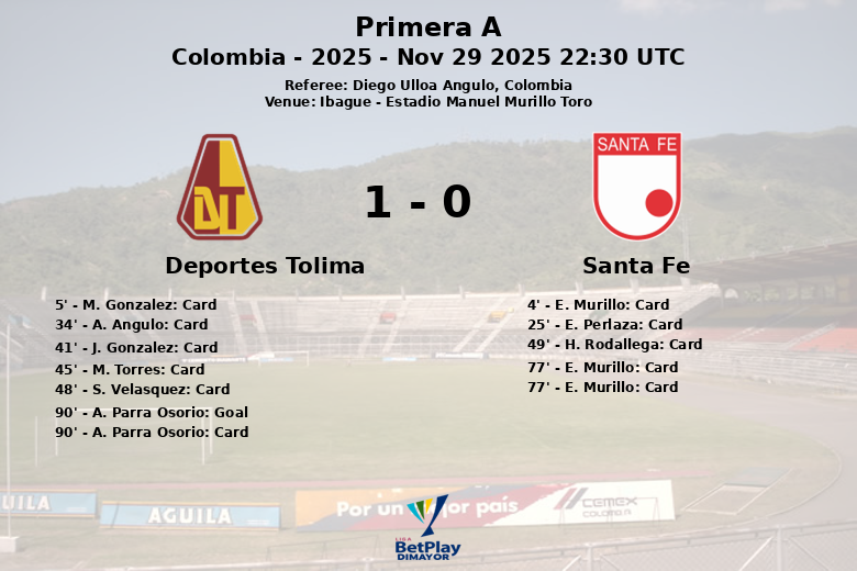 Malgré le fait de jouer en infériorité numérique, Santa Fe a résisté héroïquement jusqu’au temps additionnel. Cependant, Deportes Tolima a réussi à briser l’égalité à la dernière minute, avec un but de A. Parra Osorio après une passe décisive de J. P. Torres Patino. Le but a déclenché l’euphorie chez les supporters locaux, mais Parra a également reçu un carton jaune pour sa célébration.