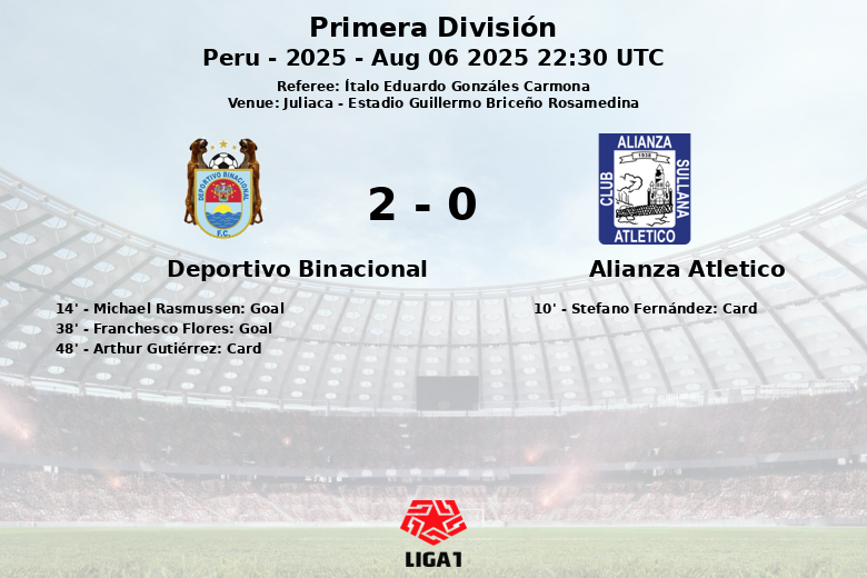 Remplacements dans l’quipe de deportivo binacional: À la 58e minute, Arthur Gutiérrez est entré et Juan Ayqque est sorti., À la 58e minute, Nilson Loyola est entré et Stefano Olaya est sorti., À la 81e minute, Franchesco Flores est entré et Róger Torres est sorti., À la 81e minute, Michael Rasmussen est entré et Nicolas Rodriguez Petrini est sorti., À la 90e minute, Lucas Rodriguez est entré et Renato Montufar est sorti.