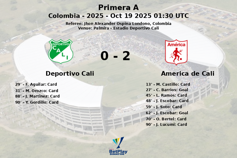 En seconde période, América a creusé l’écart à la 62e minute avec un but de Jhon Escobar, après une passe décisive de J. Lucumi. Le Deportivo Cali, malgré sa domination en termes de possession et 18 tirs (seulement 3 cadrés), n’a pas réussi à concrétiser ses occasions. La rencontre s’est poursuivie avec un nombre élevé de fautes des deux côtés et une pluie de cartons jaunes, ajoutant quatre de plus pour América (J. Escobar, J. Soto, O. Bertel, J. Lucumi) et deux pour le Deportivo Cali (J. Martinez, Y. Gordillo). Le résultat final reflète l’efficacité de l’América de Cali, qui a su capitaliser sur ses opportunités face à un Deportivo Cali qui a dominé la possession mais a manqué de mordant.
