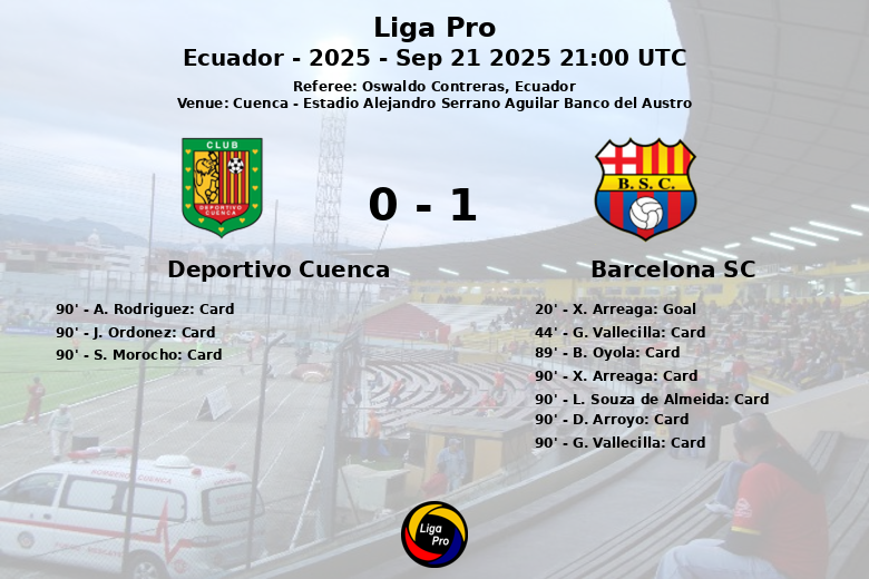 L’intensité du match s’est reflétée dans le nombre élevé d’avertissements, surtout dans les dernières minutes. Barcelona SC a accumulé six cartons jaunes, dont un pour X. Arreaga, le buteur, et un carton rouge pour G. Vallecilla à la 90e minute. Deportivo Cuenca, pour sa part, a reçu trois cartons jaunes. L’arbitre Oswaldo Contreras a passé une soirée chargée à essayer de garder le contrôle d’un match qui s’est enflammé dans les derniers instants.