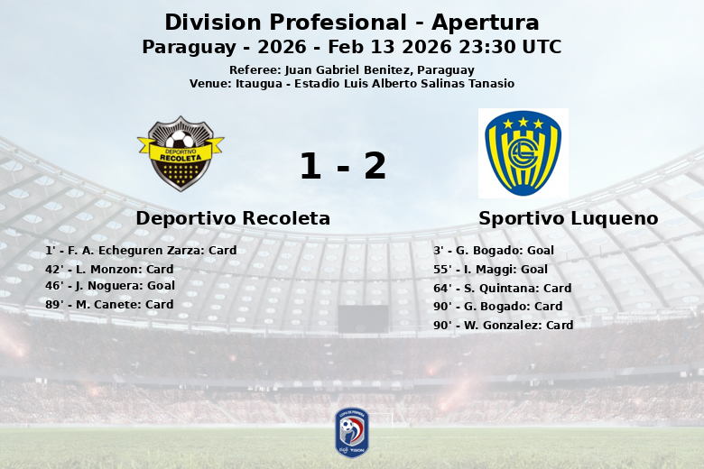Sportivo Luqueño a pris l’avantage dès le début avec un but de G. Bogado à la 3e minute. Deportivo Recoleta a tenté de réagir, et juste avant la mi-temps, J. Noguera a égalisé à la 46e minute. Cependant, I. Maggi a redonné l’avantage à Sportivo Luqueño à la 55e minute, scellant ainsi le score final de 2-1.