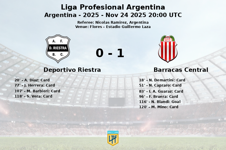 Barracas Central a décroché une victoire difficile un à zéro contre Deportivo Riestra à l’Estadio Guillermo Laza de Flores, assurant ainsi sa progression dans la Liga Profesional Argentina. Le match, arbitré par Nicolás Ramírez, a été marqué par une forte tension et de nombreuses interruptions, reflétées par les multiples cartons distribués.