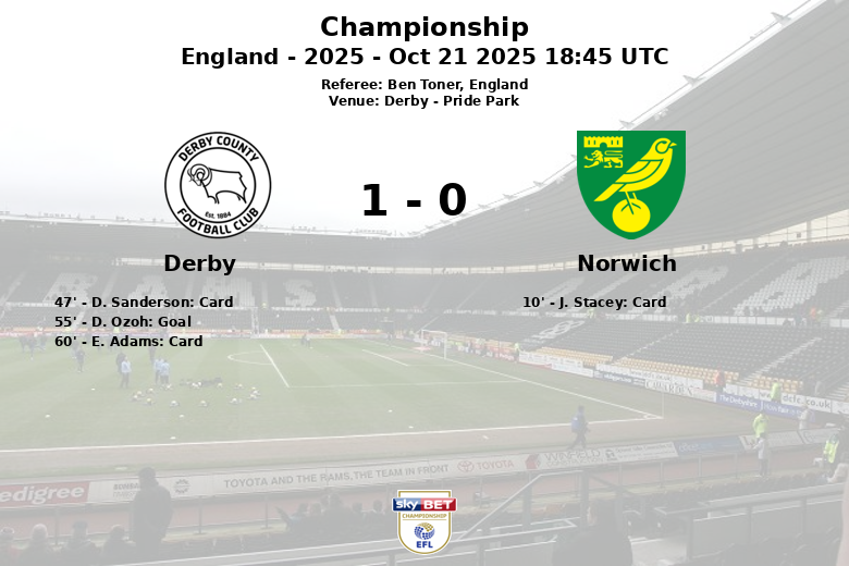 D. Ozoh, assisté par P. Agyemang, a marqué le seul but du match à la 55ème minute pour Derby, déclenchant la joie dans les tribunes. Derby a accumulé deux cartons jaunes supplémentaires pour D. Sanderson (min 47) et E. Adams (min 60). Malgré la pression constante de Norwich, qui a tenté 17 tirs, seuls 3 ont été cadrés. La défense de Derby s’est montrée solide, et l’équipe a réussi à conserver son avantage jusqu’à la fin. Norwich a obtenu 13 corners contre 5 pour Derby.