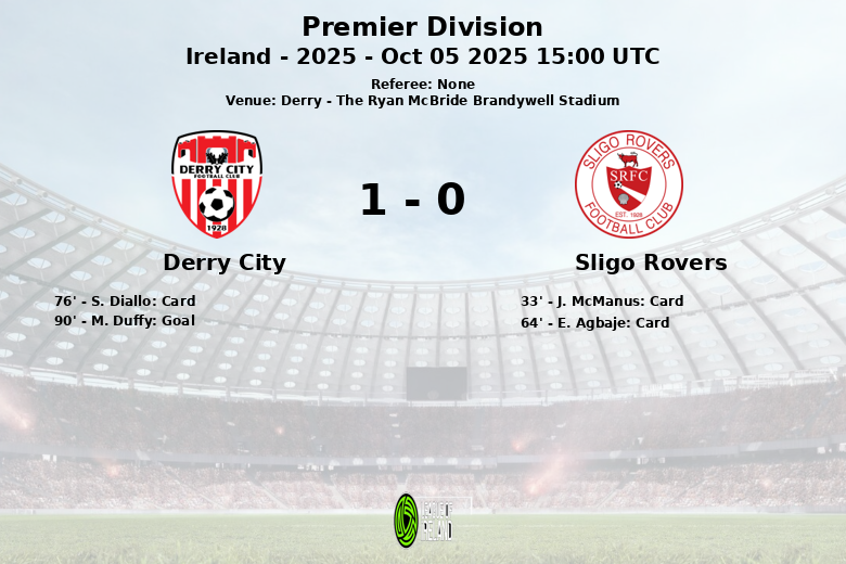 Derry, Irlande – Dans un match disputé au The Ryan McBride Brandywell Stadium, Derry City a décroché une victoire dramatique 1-0 contre Sligo Rovers lors de la 33e journée de la Premier Division irlandaise. Le match, dominé par Derry City avec 55% de possession et 19 tirs (6 cadrés), semblait se diriger vers un match nul et vierge. Cependant, un but de M. Duffy à la 90e minute, sur une passe décisive de R. Benson, a déclenché l’euphorie chez les supporters locaux.