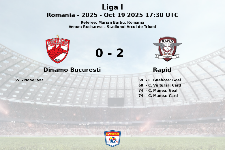 Bucarest, le 19 octobre 2025 – Un match rempli de tension et de moments cruciaux s’est déroulé aujourd’hui au Stadionul Arcul de Triumf, où Dinamo Bucuresti et Rapid ont fait match nul lors d’un match comptant pour la 13e journée de Liga I. Le match, joué sous l’œil attentif de l’arbitre Marian Barbu, a tenu les supporters en haleine.