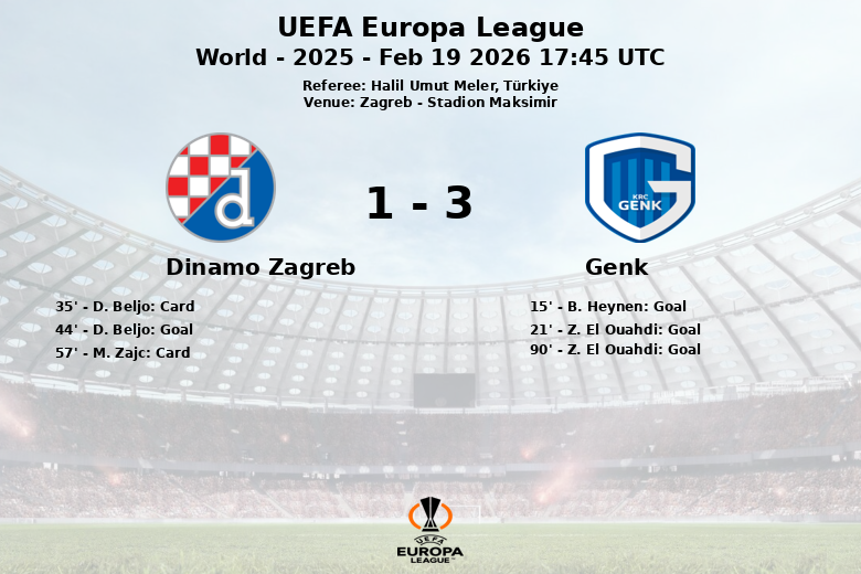 À la 90e minute, Z. El Ouahdi a scellé le match avec son deuxième but de la soirée, sur une passe décisive de D. Heymans, assurant la victoire de Genk. Le match a été caractérisé par un jeu dynamique, avec 12 tirs de Genk (6 cadrés) contre 8 pour le Dinamo Zagreb (2 cadrés). L’arbitre turc Halil Umut Meler a averti deux joueurs du Dinamo Zagreb avec des cartons jaunes.