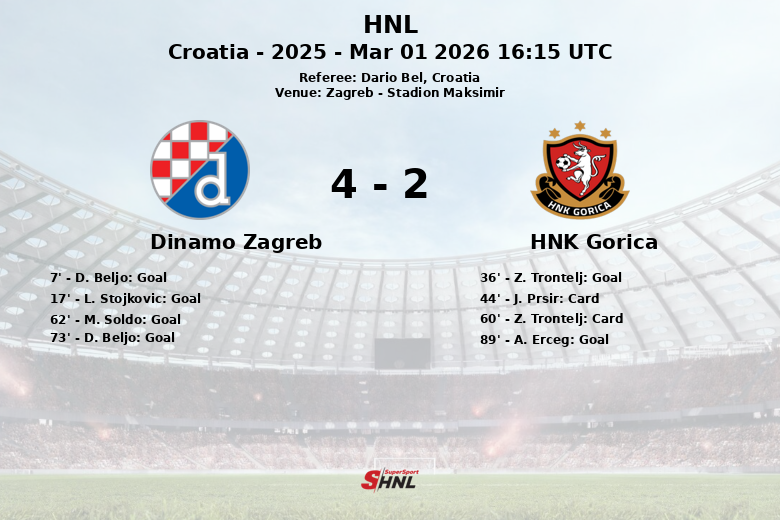 En seconde période, le Dinamo Zagreb a réaffirmé sa domination. M. Soldo a marqué le troisième but à la 62e minute, servi par L. Stojkovic. À la 73e minute, D. Beljo a transformé un penalty, augmentant l’avance de l’équipe locale. Dans les dernières minutes, à la 89e minute, A. Erceg a marqué un autre penalty pour le HNK Gorica, améliorant quelque peu le score final.