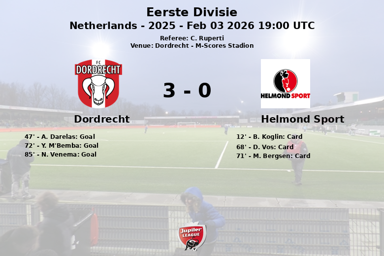 Dordrecht a pris l’avantage tôt en seconde période, à la 47e minute, grâce à un but de A. Darelas. La maîtrise du ballon par Dordrecht, avec 57 % de possession, s’est traduite par des attaques constantes vers le but adverse. Helmond Sport, en revanche, a été contraint de commettre de nombreuses fautes, ce qui a entraîné trois cartons jaunes (B. Koglin à la 12e minute, D. Vos à la 68e minute et M. Bergsen à la 71e minute).