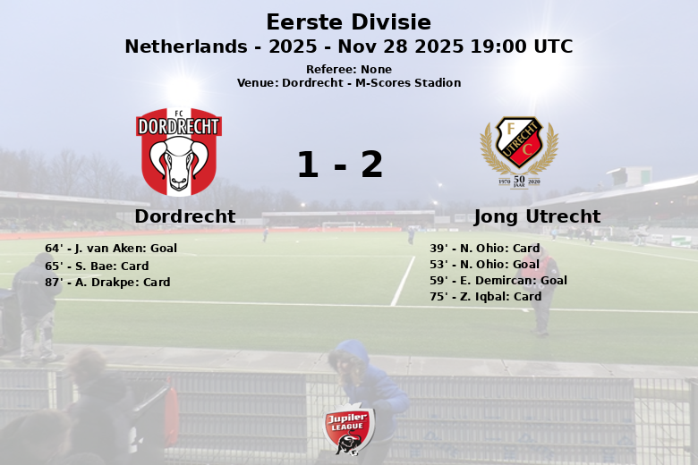 Remplacements dans l’quipe de jong utrecht: À la 66e minute, M. Jensen est entré et G. Arcos est sorti., À la 66e minute, E. Demircan est entré et V. Plantinga est sorti., À la 81e minute, Z. Iqbal est entré et N. Dundas est sorti., À la 82e minute, S. van der Wegen est entré et M. Ghaddari est sorti., À la 90e minute, J. Mukeh est entré et B. van den Boogaard est sorti.