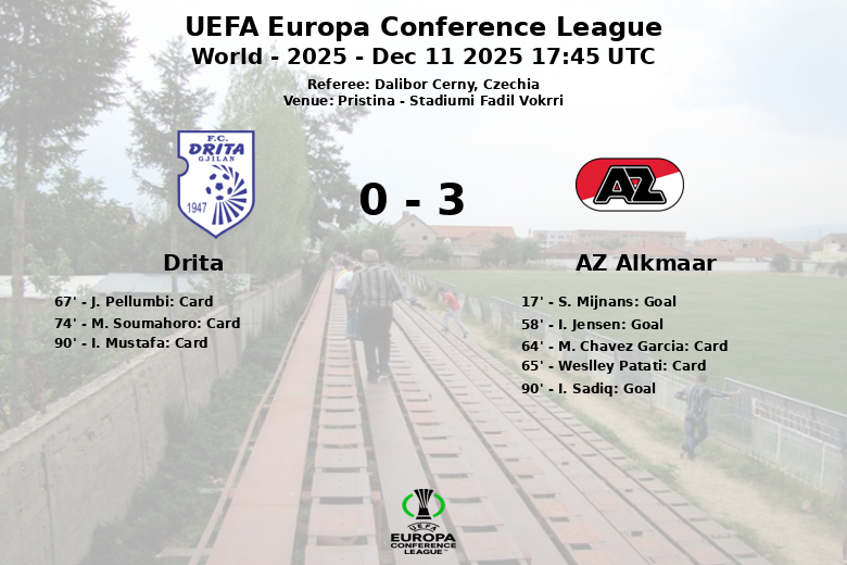 Pristina, 11 décembre 2025 – L’AZ Alkmaar s’est imposé avec autorité face au Drita au Stadiumi Fadil Vokrri, lors d’un match de la phase de groupes de l’UEFA Europa Conference League. L’équipe néerlandaise a contrôlé le match dès le début, ce qui s’est traduit par une possession de balle de 67 %. Le premier but est intervenu à la 17e minute, œuvre de S. Mijnans, sur une passe décisive d’I. Jensen.