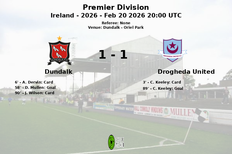 Le match s’est terminé par un carton jaune pour J. Wilson de Dundalk à la 90e minute. Malgré la domination territoriale de Dundalk et leur plus grand nombre de corners (7 contre 3), Drogheda United s’est révélé être un adversaire tenace, rapportant un point précieux de sa visite à Oriel Park.