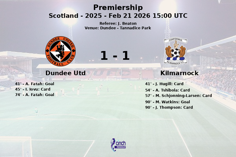 Le match a été particulièrement intense en deuxième mi-temps. À la 41e minute, Dundee United a eu l’occasion d’ouvrir le score sur penalty, mais A. Fatah a manqué sa tentative. Cependant, il se rachètera à la 74e minute, en marquant un but après une passe décisive de W. Ferry. Kilmarnock, qui a accumulé quatre cartons jaunes et un carton rouge, a persisté dans sa recherche d’un but égalisateur, qui est finalement arrivé à la 90e minute grâce à M. Watkins, servi par G. Kiltie. Le match, arbitré par J. Beaton, a mis en évidence l’esprit de compétition des deux équipes dans la Premiership écossaise.