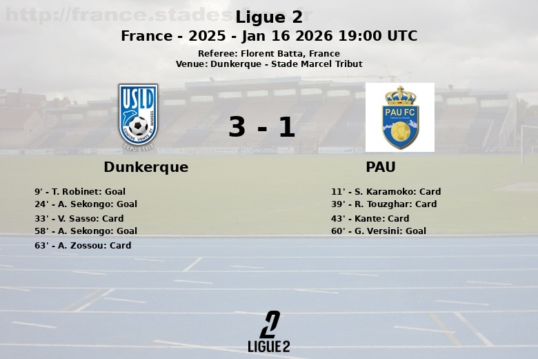 Dunkerque, France – Dans un match comptant pour la 19e journée de Ligue 2, Dunkerque a remporté la victoire contre Pau, avec un score reflétant l’intensité du jeu. Le match, disputé au Stade Marcel Tribut, a vu Dunkerque prendre l’avantage dès le début avec un but de T. Robinet à la 9e minute, sans passe décisive. Ils ont accru leur avance grâce à un doublé de A. Sekongo, marquant aux 24e et 58e minutes ; le deuxième but avec une passe décisive de G. Kondo.