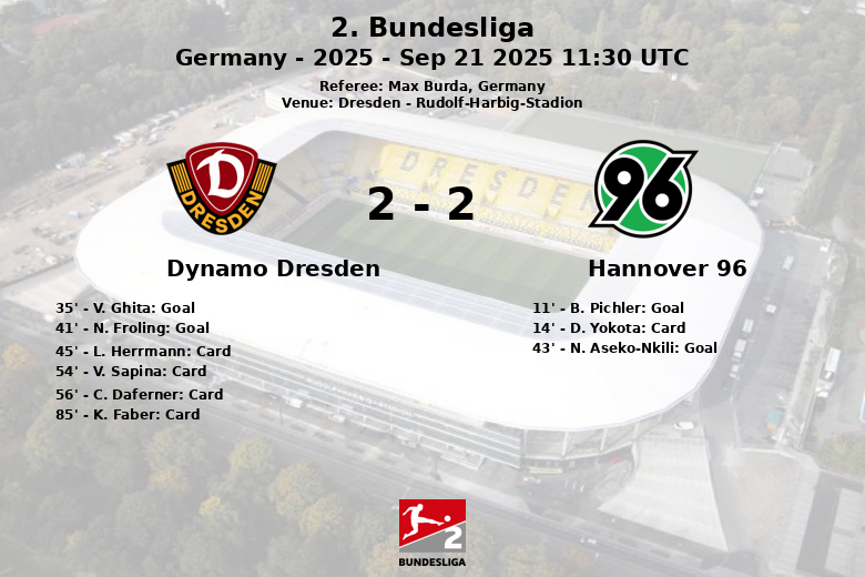 Hanovre 96 a pris l’avantage à la 11e minute grâce à un but de B. Pichler sur penalty. Cependant, le Dynamo Dresde a répondu avec détermination. Un but contre son camp de V. Ghita à la 35e minute a égalisé le score, et N. Froling a donné l’avantage à l’équipe locale à la 41e minute. La joie du Dynamo Dresde a été de courte durée, car N. Aseko-Nkili a égalisé pour Hanovre 96 à la 43e minute, avec une passe décisive de M. Neubauer.