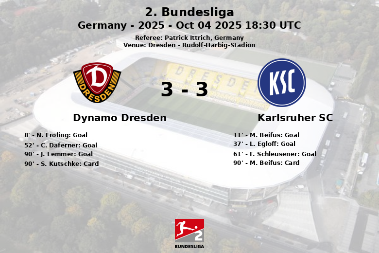 En seconde période, C. Daferner a égalisé pour le Dynamo Dresde à la 52e minute, sur une passe décisive de J. Oehmichen. F. Schleusener a redonné l’avantage au Karlsruher SC à la 61e minute, sur une passe décisive de R. Pinto Pedrosa. Au moment où la victoire semblait s’éloigner, J. Lemmer a sauvé un point pour le Dynamo Dresde avec un but dans la dernière minute du temps réglementaire.