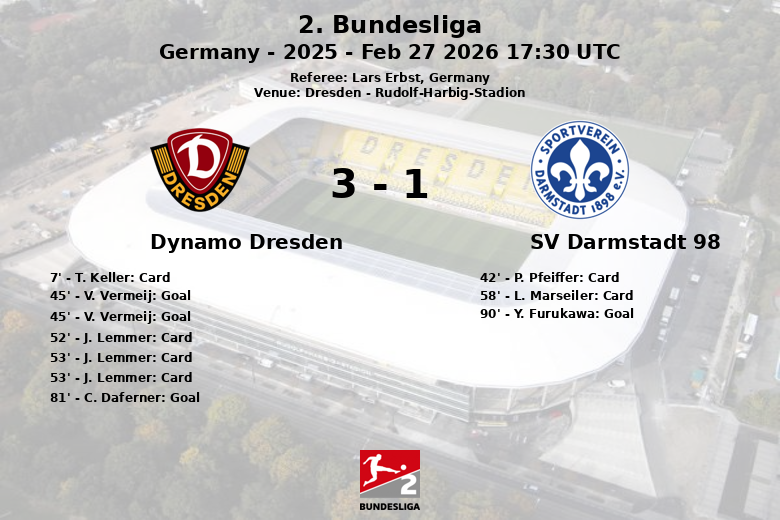 La deuxième mi-temps a conservé la même intensité. J. Lemmer du Dynamo Dresde a reçu deux cartons jaunes consécutifs aux 52e et 53e minutes, entraînant son expulsion et équilibrant le nombre de joueurs sur le terrain. L. Marseiler du SV Darmstadt 98 a également reçu un carton jaune à la 58e minute. C. Daferner du Dynamo Dresde a creusé l’écart à la 81e minute, portant le score à 3 à 0. Dans les dernières minutes, Y. Furukawa du SV Darmstadt 98 a réussi à marquer à la 90e minute, sur une passe de A. Vukotic, mais cela n’a pas suffi à changer le cours du match.
