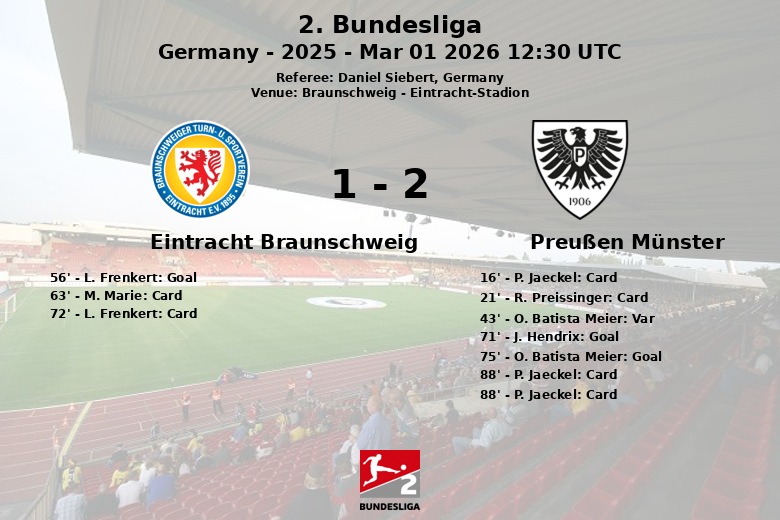 En seconde période, Frenkert a ouvert le score pour Braunschweig à la 56e minute, sur une passe d’Ehlers. Cependant, la joie locale a été de courte durée, car Hendrix a égalisé pour Münster à la 71e minute, sur une passe de ter Horst. Seulement quatre minutes plus tard, Batista Meier a racheté son but refusé et a mis Münster en tête.