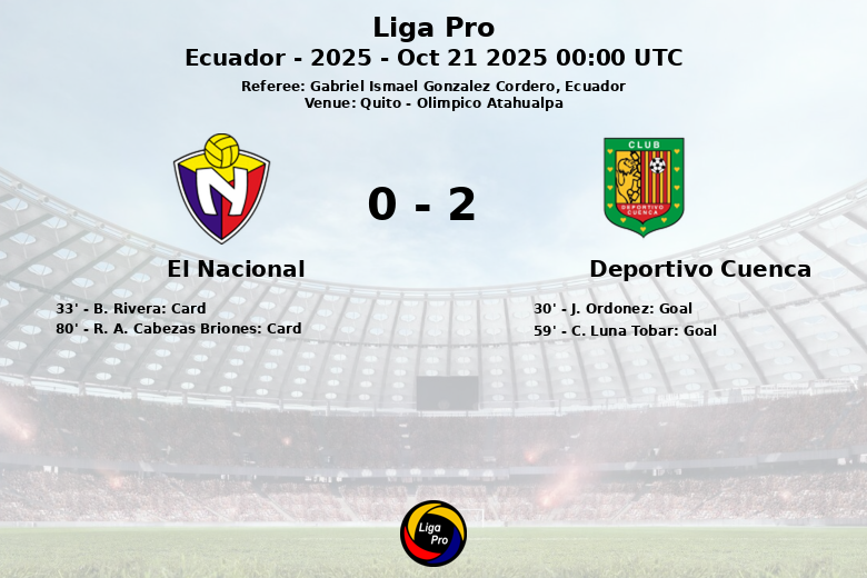 En seconde période, à la 59e minute, C. Luna Tobar a creusé l’écart pour Deportivo Cuenca, avec une passe décisive de A. Rodriguez. La situation s’est encore compliquée pour El Nacional lorsque R. A. Cabezas Briones a reçu un carton rouge à la 80e minute, laissant son équipe à dix.
