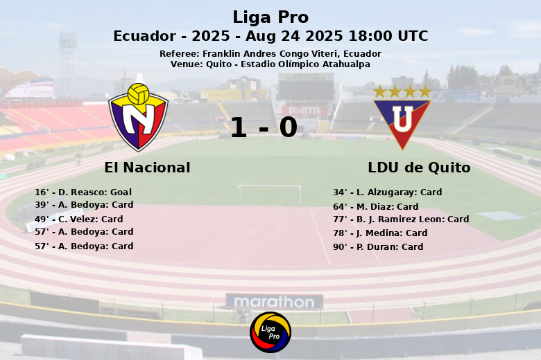 Le match s’est décidé à la 16e minute lorsque D. Reasco, assisté par J. Chala, a marqué le seul but du match pour El Nacional. À partir de ce moment, le jeu s’est caractérisé par un rythme intense et de nombreuses fautes. L’arbitre, Franklin Andres Congo Viteri, a distribué un total de sept cartons jaunes aux joueurs de LDU (L. Alzugaray, M. Diaz, B. J. Ramirez Leon, J. Medina, P. Duran) et trois aux joueurs d’El Nacional (A. Bedoya, C. Velez). De plus, A. Bedoya d’El Nacional a reçu un deuxième carton jaune qui a entraîné son expulsion à la 57e minute, laissant son équipe à dix joueurs.
