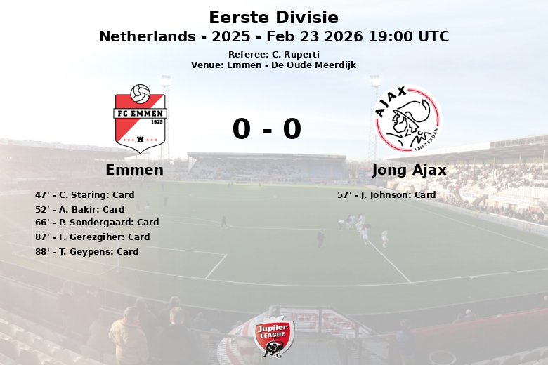 Emmen, Pays-Bas – Dans un match disputé au De Oude Meerdijk, Emmen et Jong Ajax ont fait match nul 0-0, une rencontre marquée par l’intensité et la bataille au milieu de terrain. L’arbitre C. Ruperti a eu une soirée chargée, distribuant un total de six cartons jaunes, cinq pour l’équipe locale et un pour Jong Ajax.