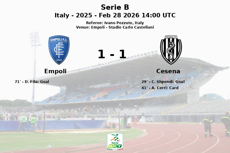 La persévérance d’Empoli a finalement été récompensée à la 71e minute, lorsque D. Fila a égalisé le score avec un but sur une passe décisive de S. Shpendi. Cesena, qui a basé son jeu sur une défense solide et des transitions rapides, a été dominé dans la possession et la création d’occasions, mais a réussi à conserver le match nul jusqu’à la fin. Le match a été caractérisé par l’intensité et la lutte au milieu de terrain, reflétées par le nombre plus élevé de fautes commises par Cesena (16) par rapport à Empoli (6). Finalement, le match s’est terminé par un partage des points, laissant un sentiment mitigé pour les deux équipes.